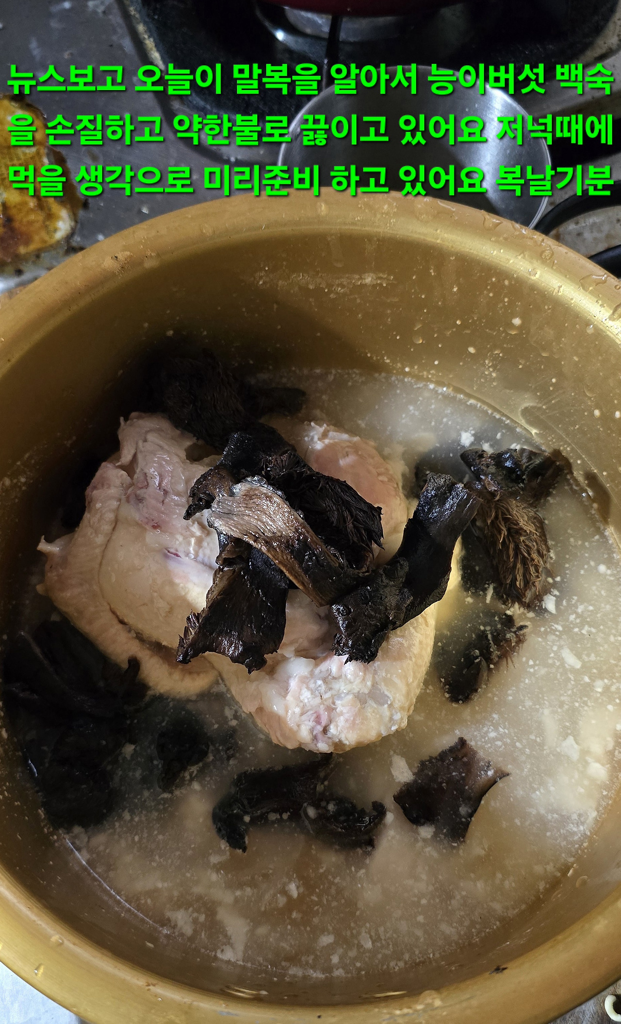 알고보니 대부분 본인사는곳이 고향이시라고 하네요 고향선배님 친인척들도 많으시고 귀가후 수확물찍고 뉴스보는데 오늘이 말복?냉동능이버섯 있고 포장삼계탕도 많아서 말복기분 내려고 능이도 많이 넣고 9시경 복날 능이백숙을?~~~~^^