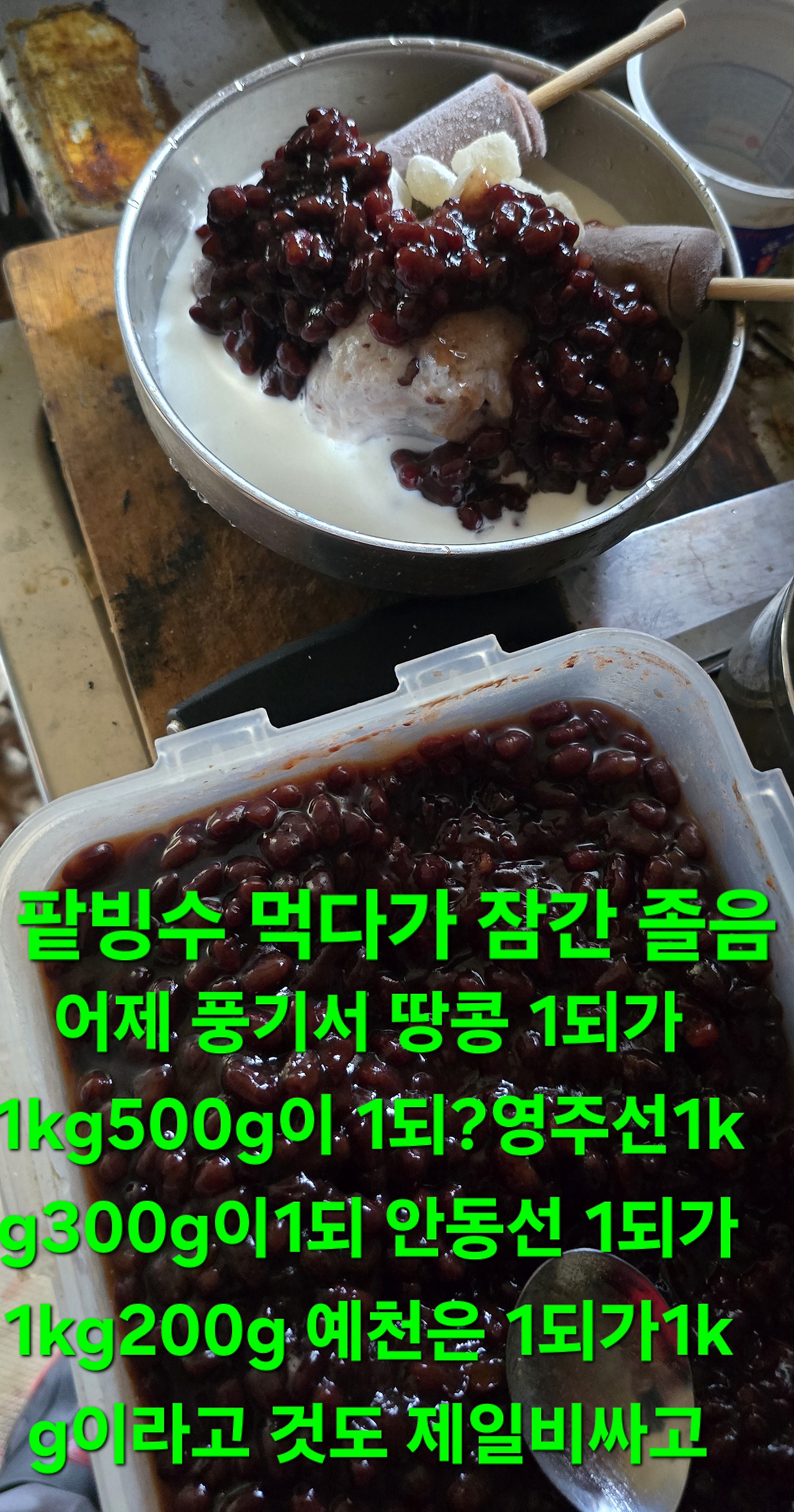 햇땅콩 한되가 풍기는1kg500g이고 영주는 1kg300g. 안동은 1k200g 하지만 예천은 1되가 1kg에 가격은 제일비싸고 2만원