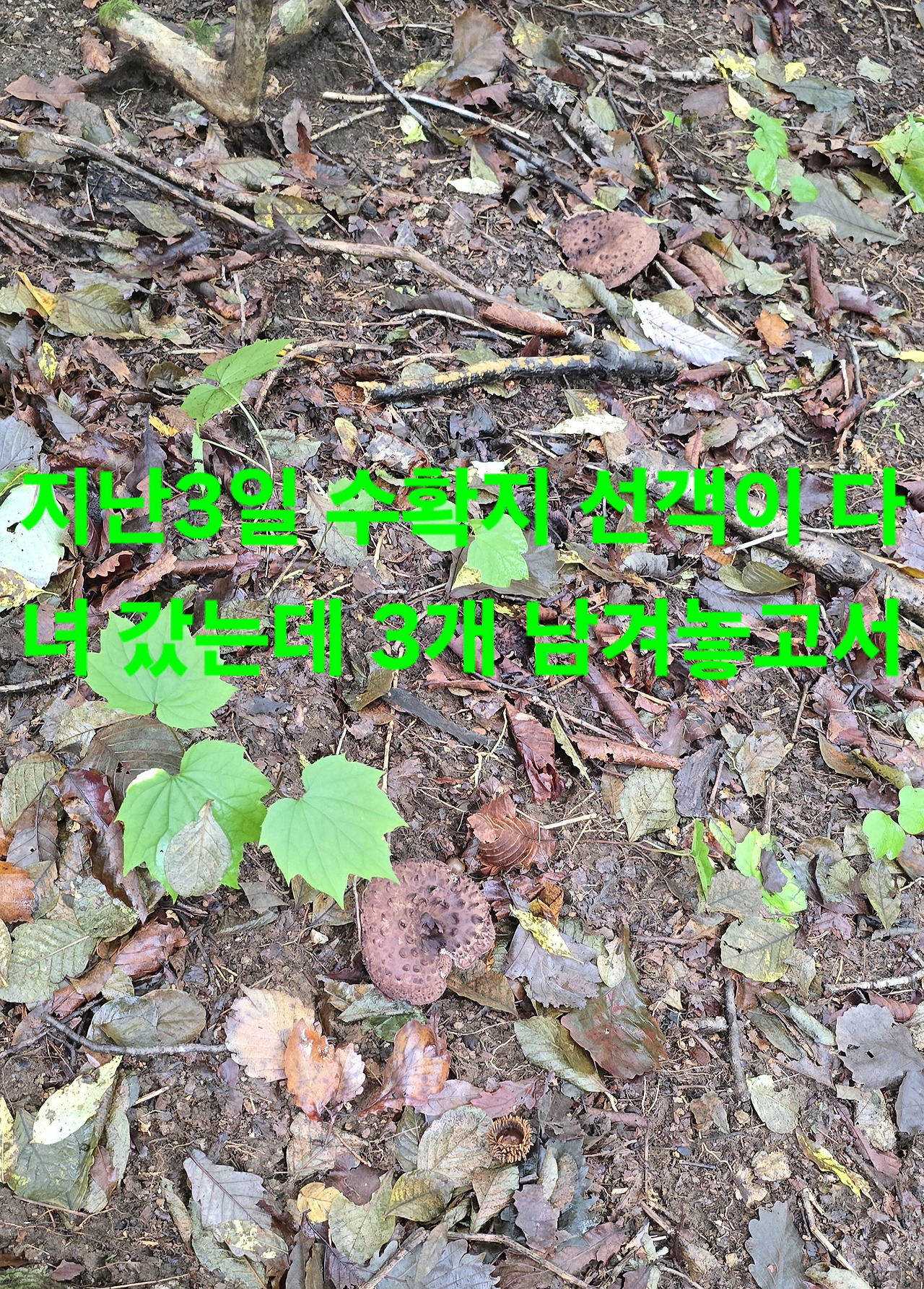 어제도 작은비 아침에도 작은비 10시18분경 회원도착 9월29일10월3일 산행지 그날은 수확후에 판매곳 수십곳 수색했으나 능이버섯은 3곳서만 3일수확지는 선객이 다녀갔으나 남겨놓은둣?정상부근서도 나오기