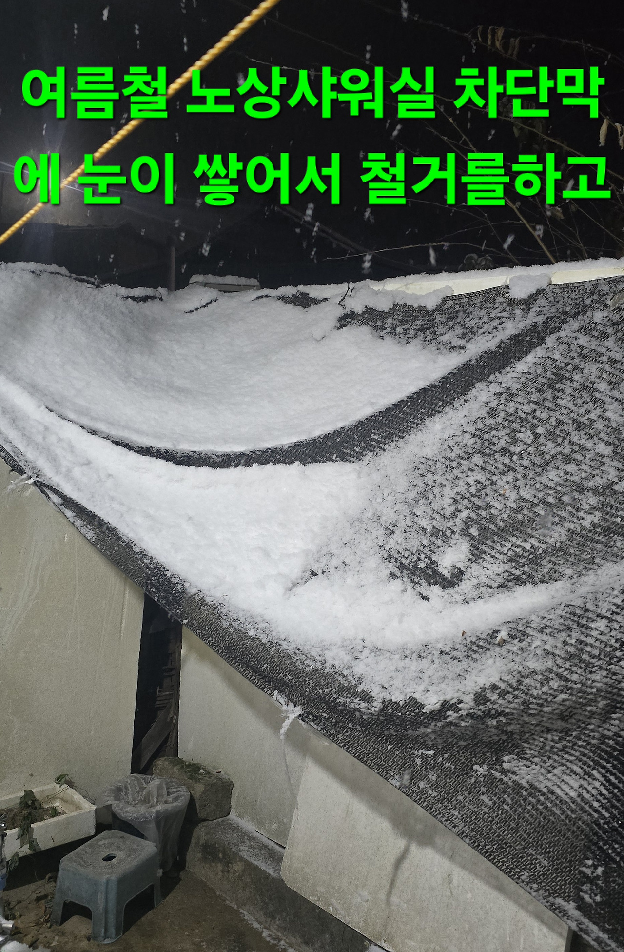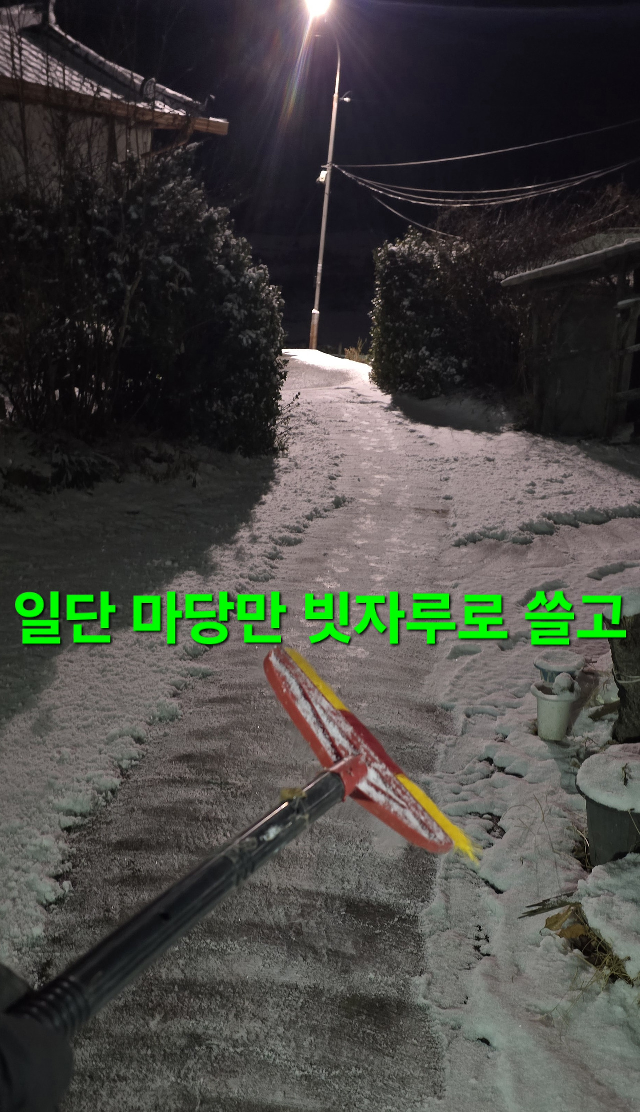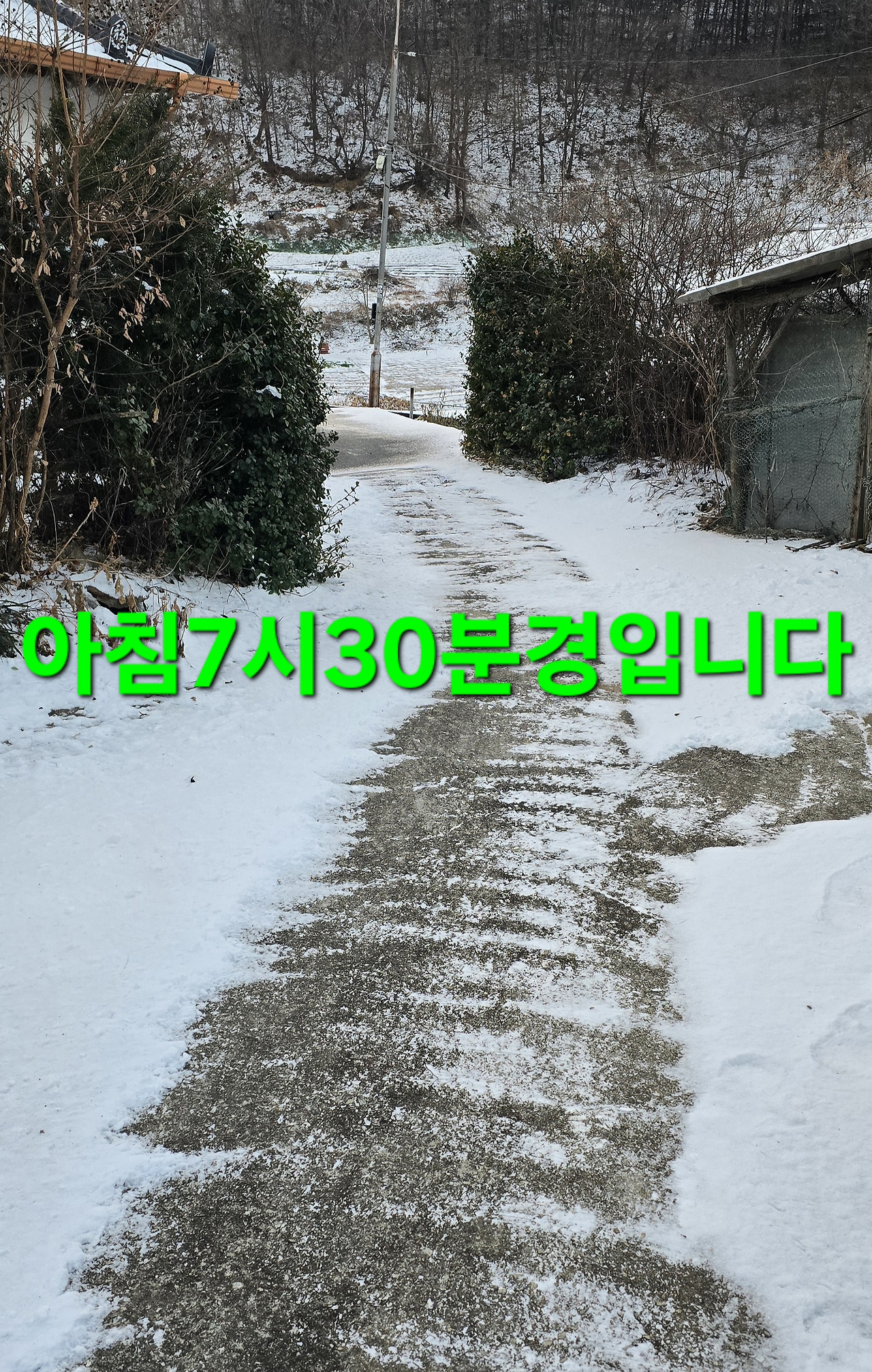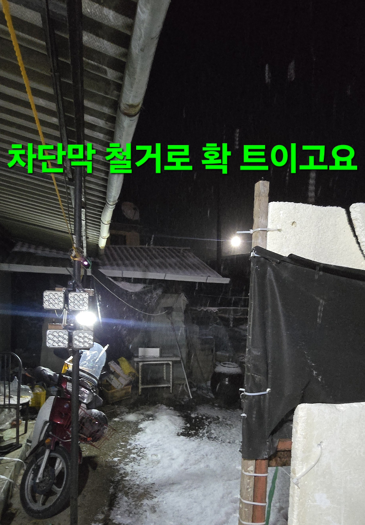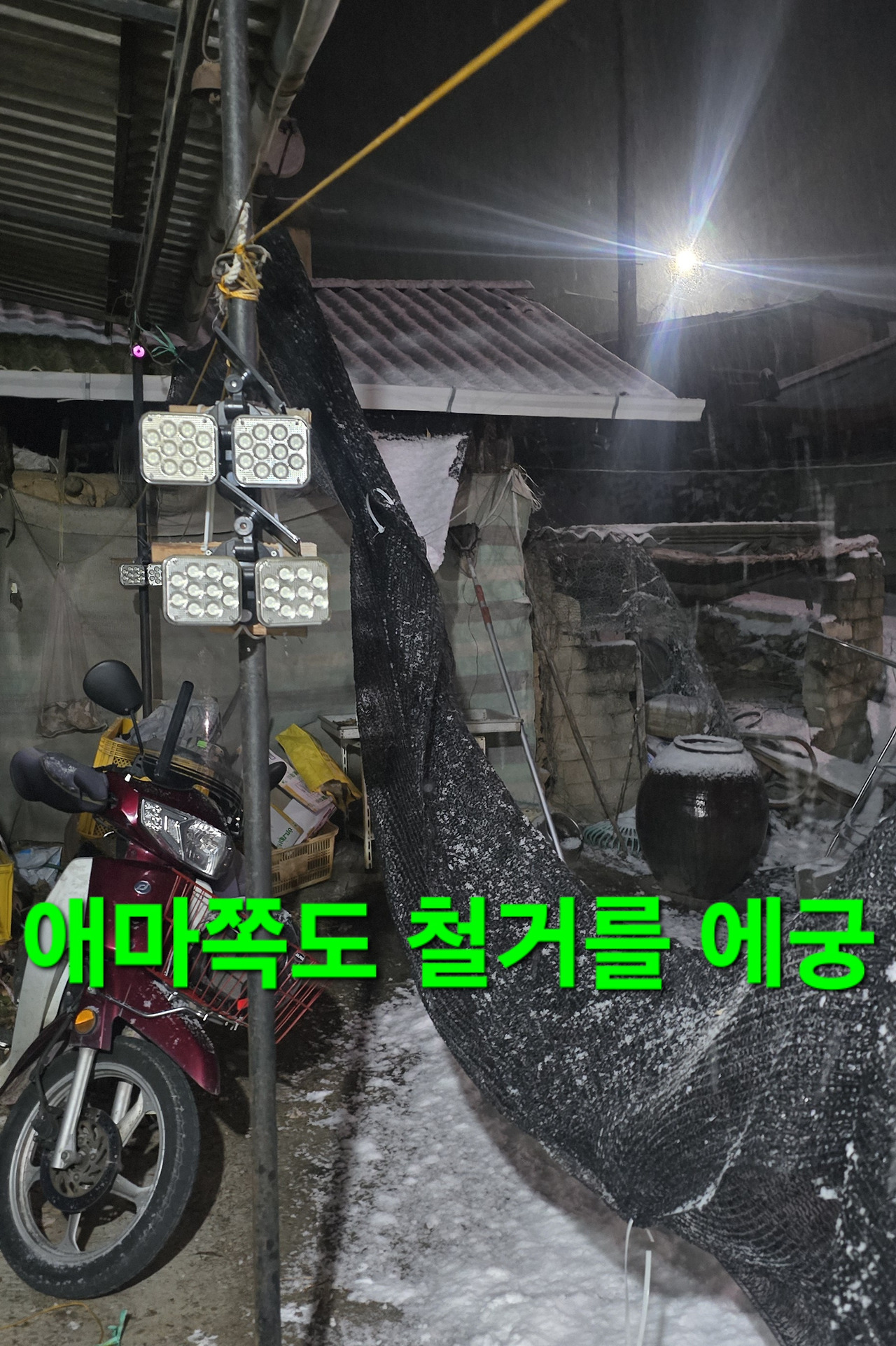 어제밤9시까지는 수많은 벌들과 보름달였으나 밤9시30분 부터 폭설에 차단막에 눈이쌓여서 얼른 철거 하지만 딱 시간반만에 폭설은 스톱?된장 음지언덕길 청소를 하는지 일찍 기상 잠 잘못자서 왼쪽어께