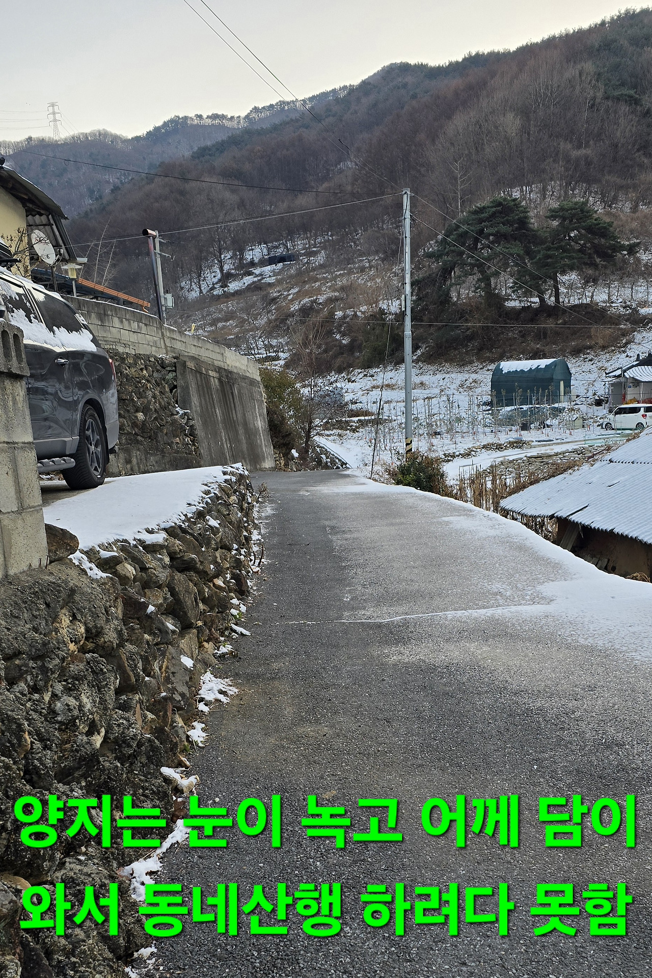 담이와서 동네산행 계획도 수포가 청소할줄 알앗으나 안하고 아침 해결후 이리저리 사진찍고 밥도하고 낮잠이나 자고 기상 눈 많이 녹고 언덕길이 문젭니다 이동가능할지?내일은ᆢ