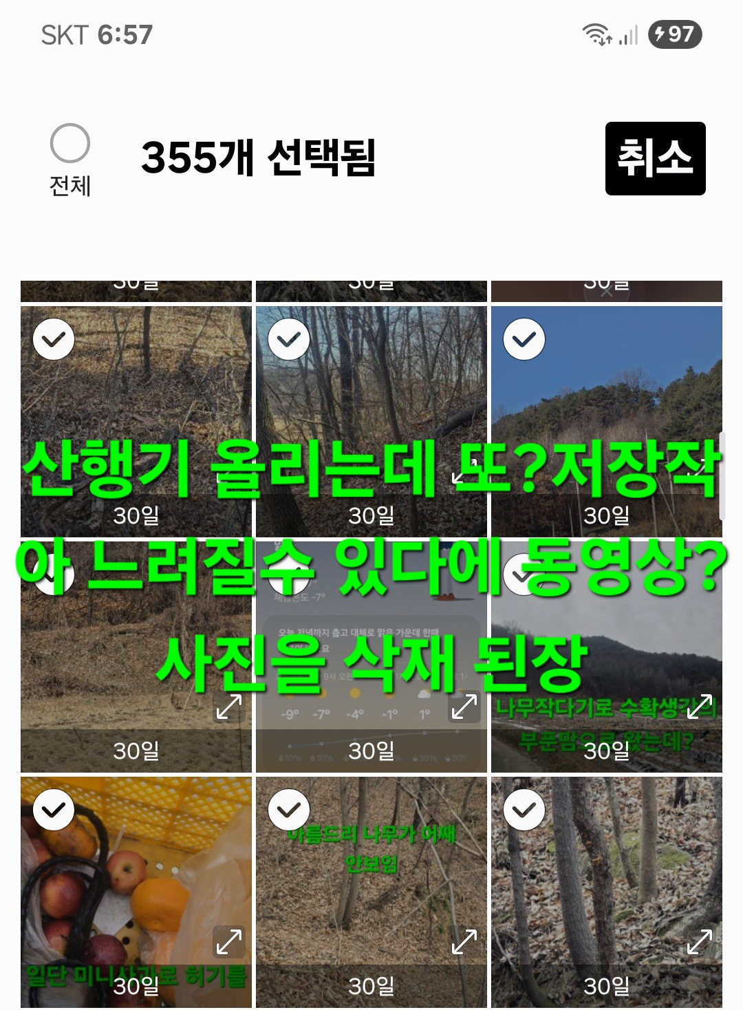 어제도 저장부족?돌겠네요 해서 불필요한 동영상 찾아 50여개 삭재후 휴지통의것도 완전 삭재 티비보다 이번주 금요일 두자리수?영하권 떡갈비 오래되여 한봉지것 볶앗으나