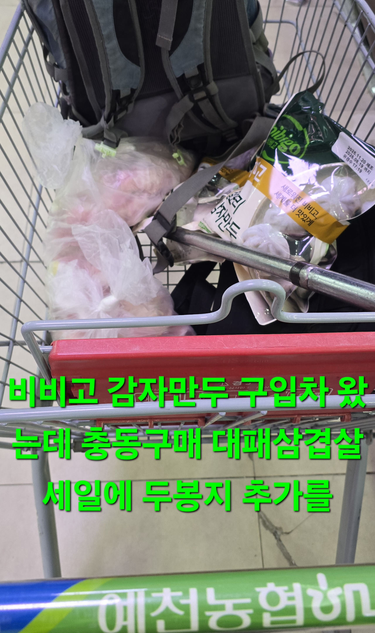 안계시여 옆사무소에 맡기고 농헙맡서 비비고 감자만두 구입차?세일중 충동구매로 대패삼겹살도 구입 귀가후 사골국물에 감자만두 넣어서 맛나게 해결후 내용글 쓰는중입니다 내일까지는 한파라고ᆢ