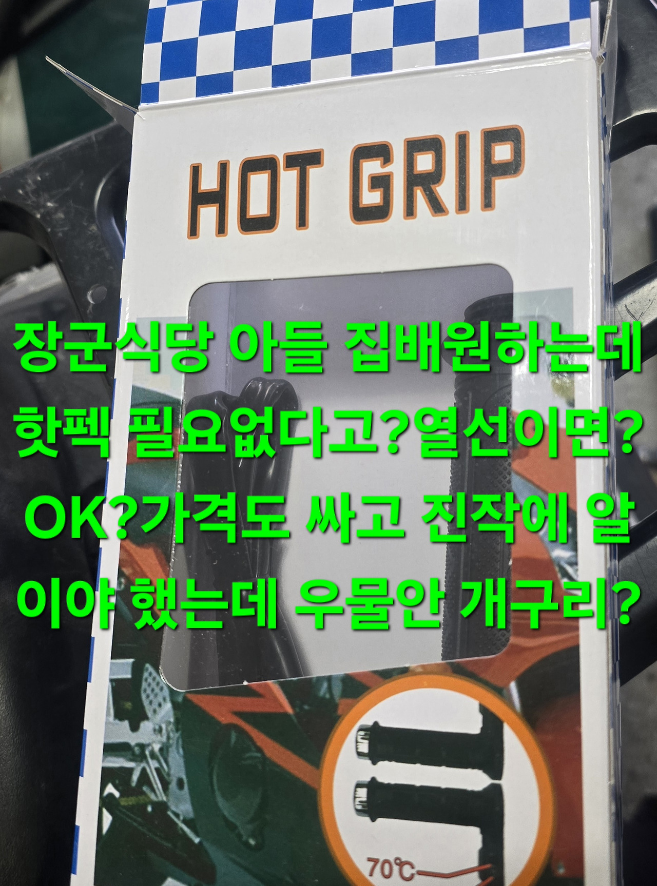 장군식당 아들이?면장갑 끼고 주행한다고 열선부착시?열선이 먼지도 모르는 상태 6만원주고 설치 양쪽 손잡이 따근해 좋아요 엔진오일도 교체후 세탁소 순번때문에 조끼만 수선 복대는 내일 맡기고 어제구입것 착용