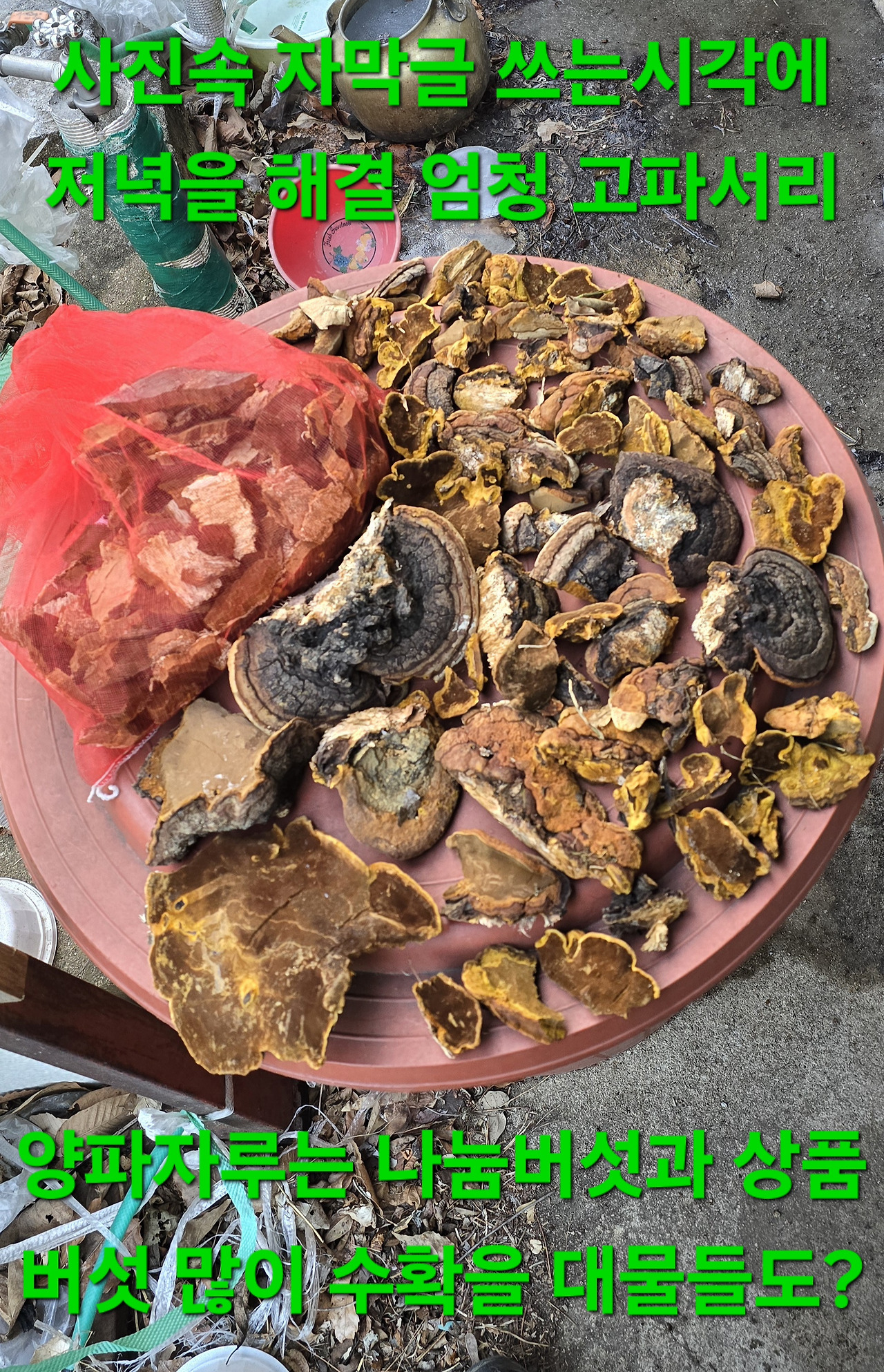 곳 간벌안한곳 안쪽도 많으나 두나무서만 수확을 왠종일 한곳보다 더 많은 수확을 하산후 안정서 기름반땅넣고 성신서 커피마시고 귀가후 수확물 찍으며 자막글 쓰는시각에 초저녁을 해결했네요 졸음이 오는데 참아아?